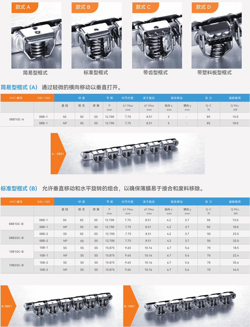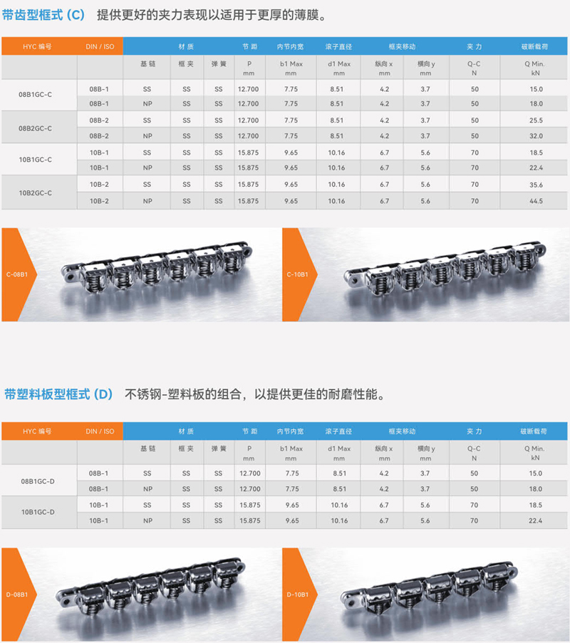 HYC夹膜链的基链有碳钢镀镍和不锈钢两种材质,均具有出色的耐腐蚀性;
